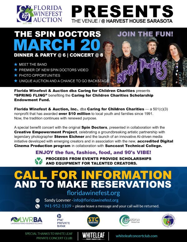 A special benefit concert with the original Spin Doctors, presented in collaboration with the Creative Empowerment Project, celebrating a groundbreaking artistic partnership with legendary photographer Steven Eichner and the launch of an innovative AI-driven media initiative developed with emerging creators and in association with the new, accredited Digital Cinema Production program in collaboration with Suncoast Technical College.
